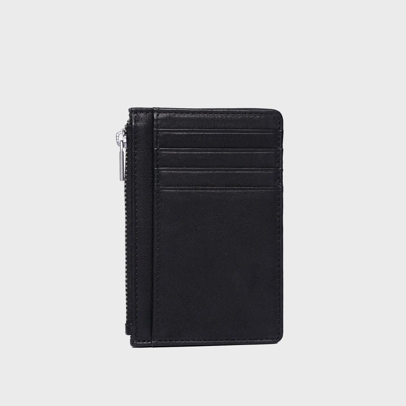Stanza Ode Wallet  / Black. Crafted from genuine leather, this wallet offers a luxurious feel and exceptional durability. It features dedicated slots to keep your cards organized and easily accessible, while a secure zippered compartment provides peace of mind for your coins or other small essentials.